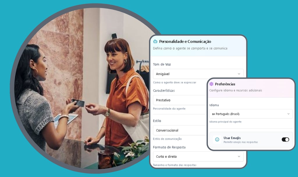 Você personaliza nome, tom de voz, personalidade e estilo de comunicação. A IA segue o seu jeitinho para atender seus clientes como você faria!
