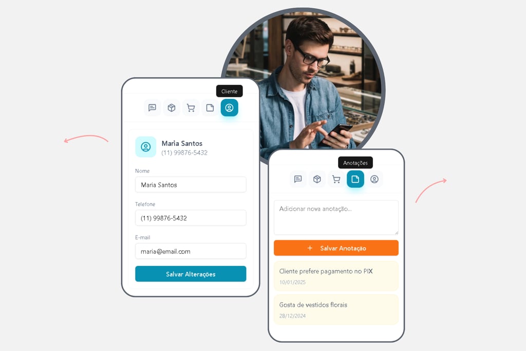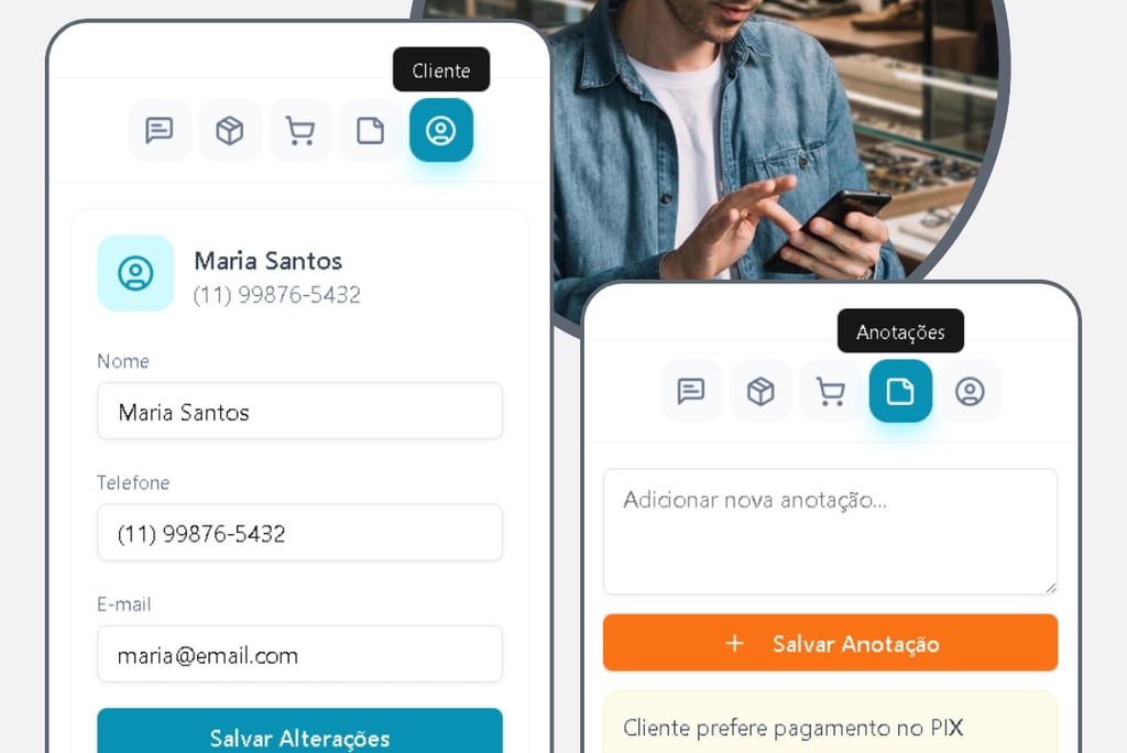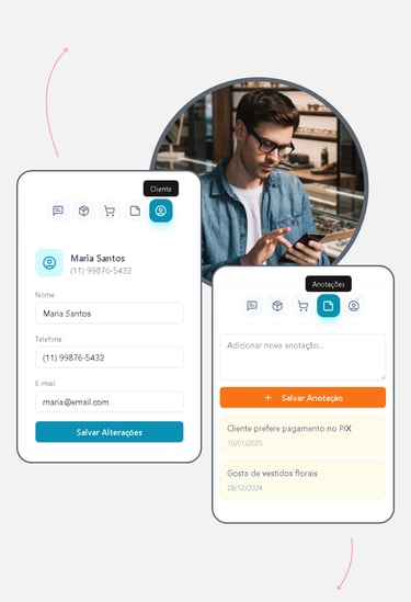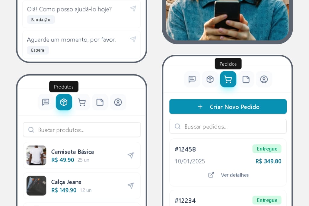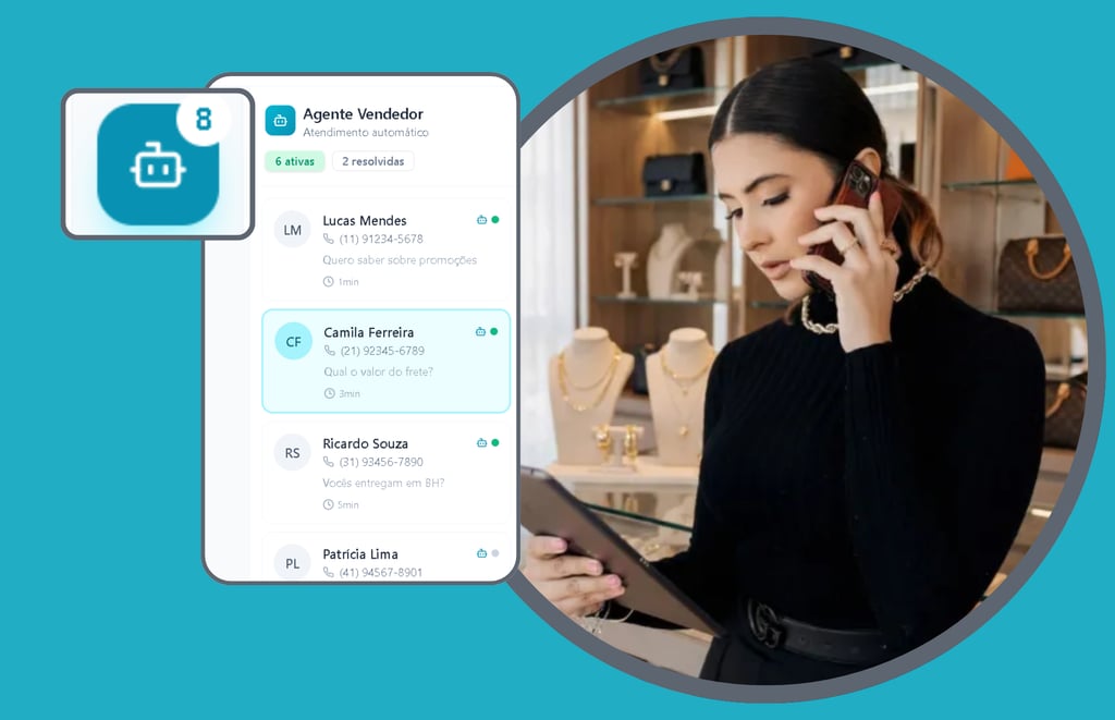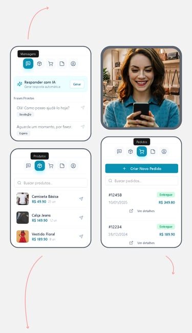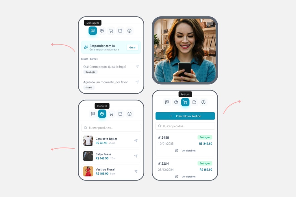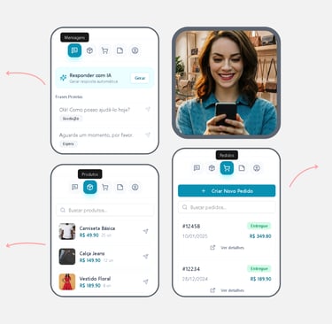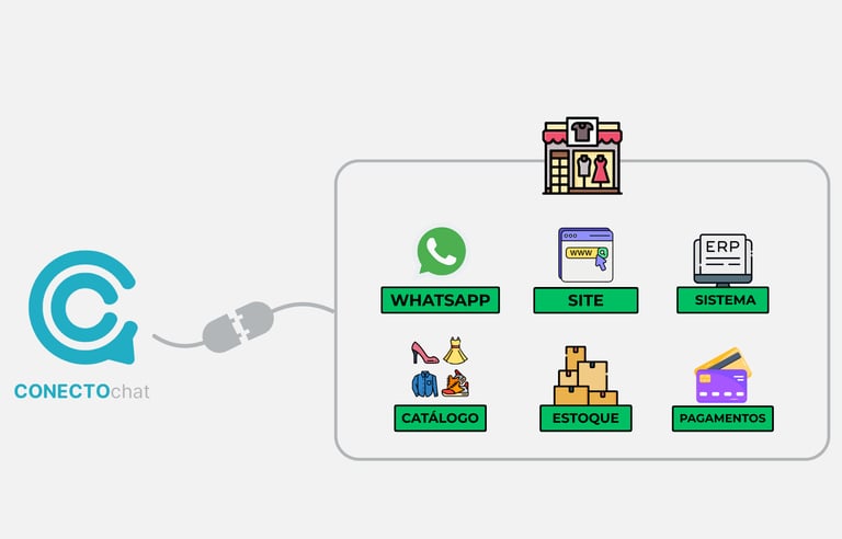 O sistema se conecta direto no WhatsApp da loja, no catálogo e no estoque em tempo real